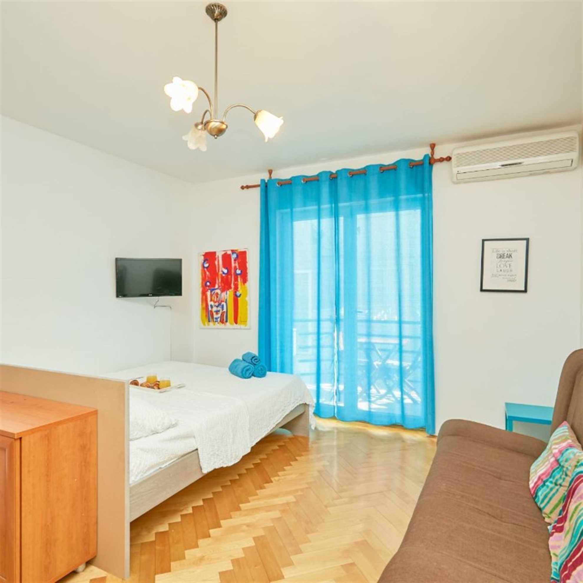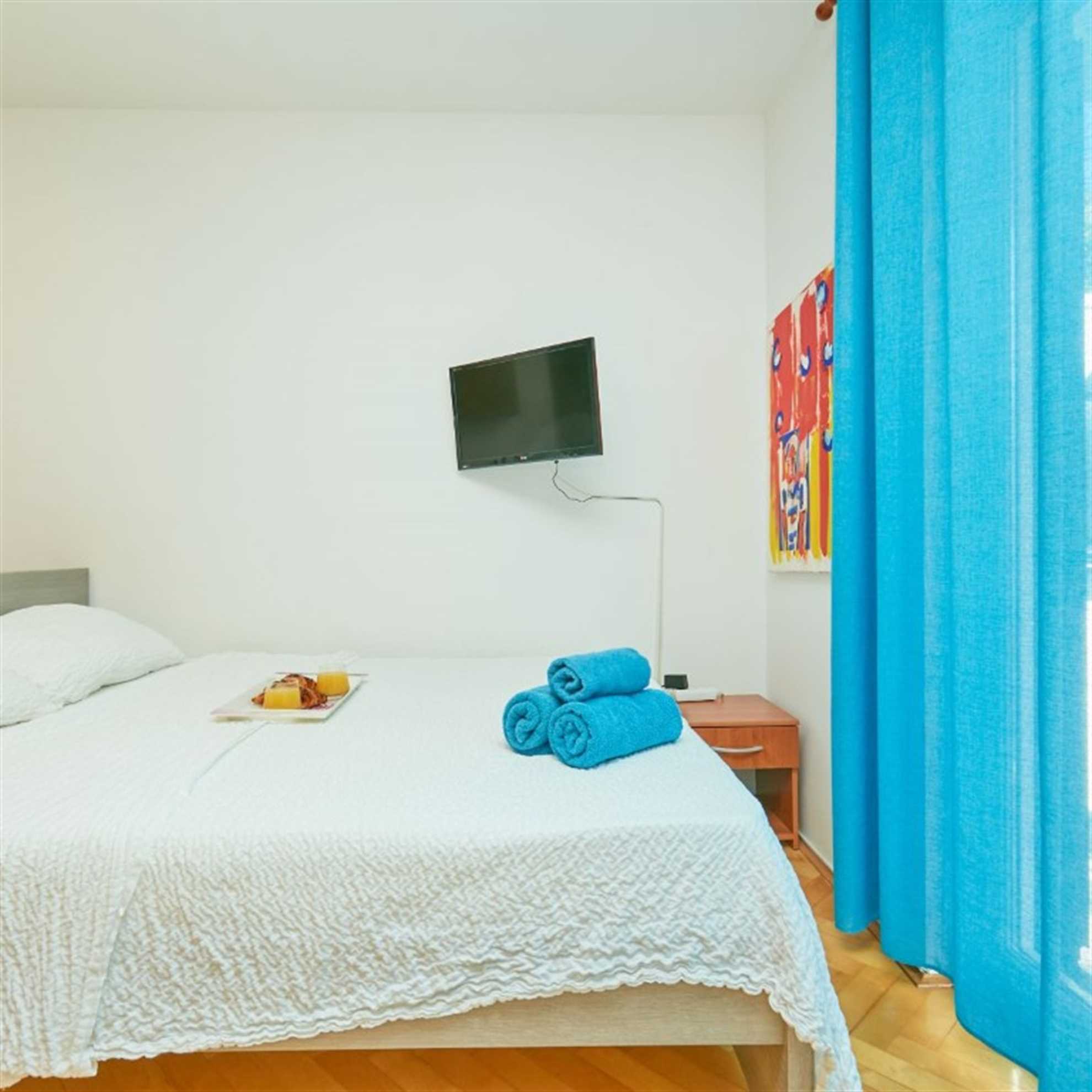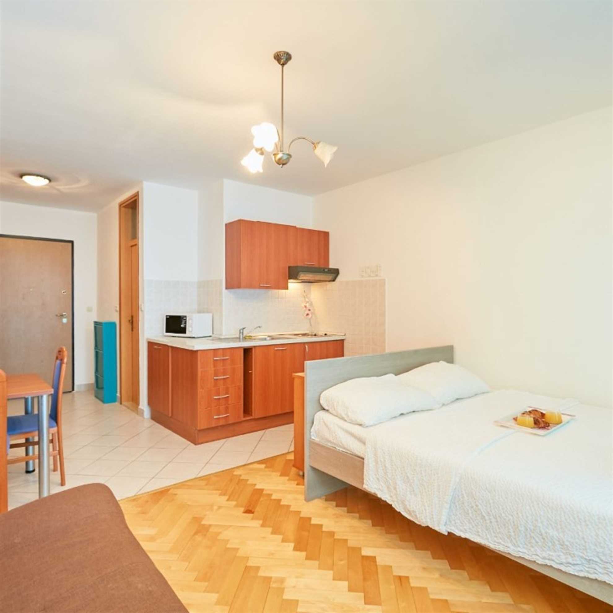 This charming studio apartment has the perfect location and anything a person could need to make his vacation as homely as possible. The space offers enough room for three people, it has 2 twin beds and a couch bed for one. It features a kitchenette equipped with kitchenware, fridge, kettle, toaster and stove top. You can use the fresh market around the corner to buy fresh groceries to prepare your first Croatian meal. If you would rather enjoy the Croatian cuisine you can surely find a nice Restaurant on Lapad promenade just outside of your apartment.