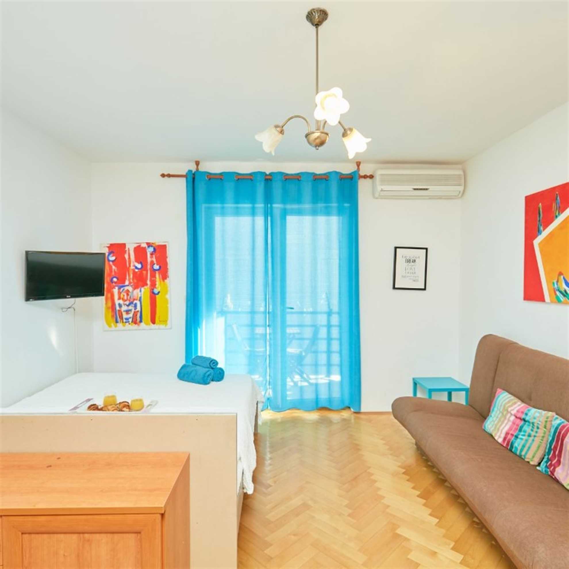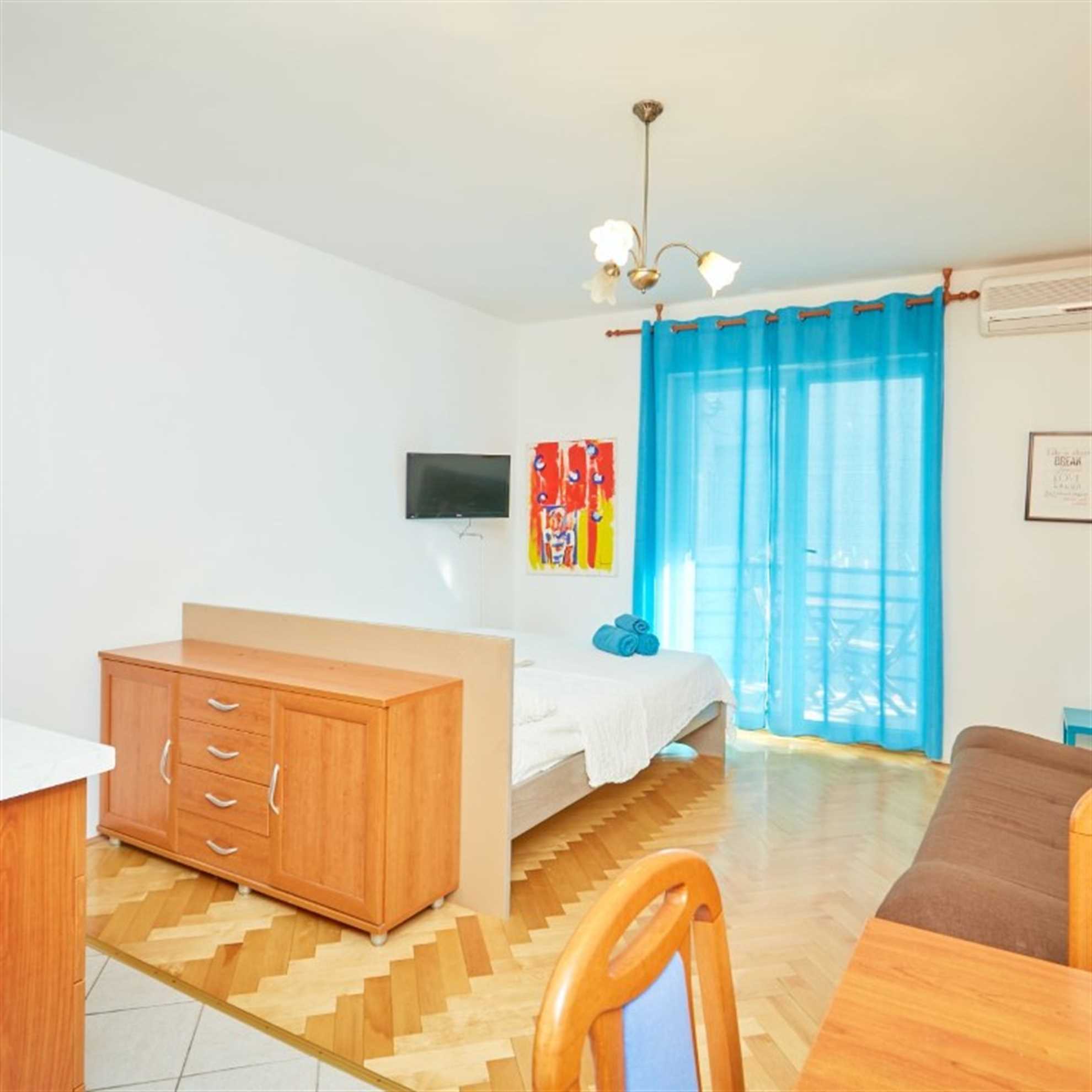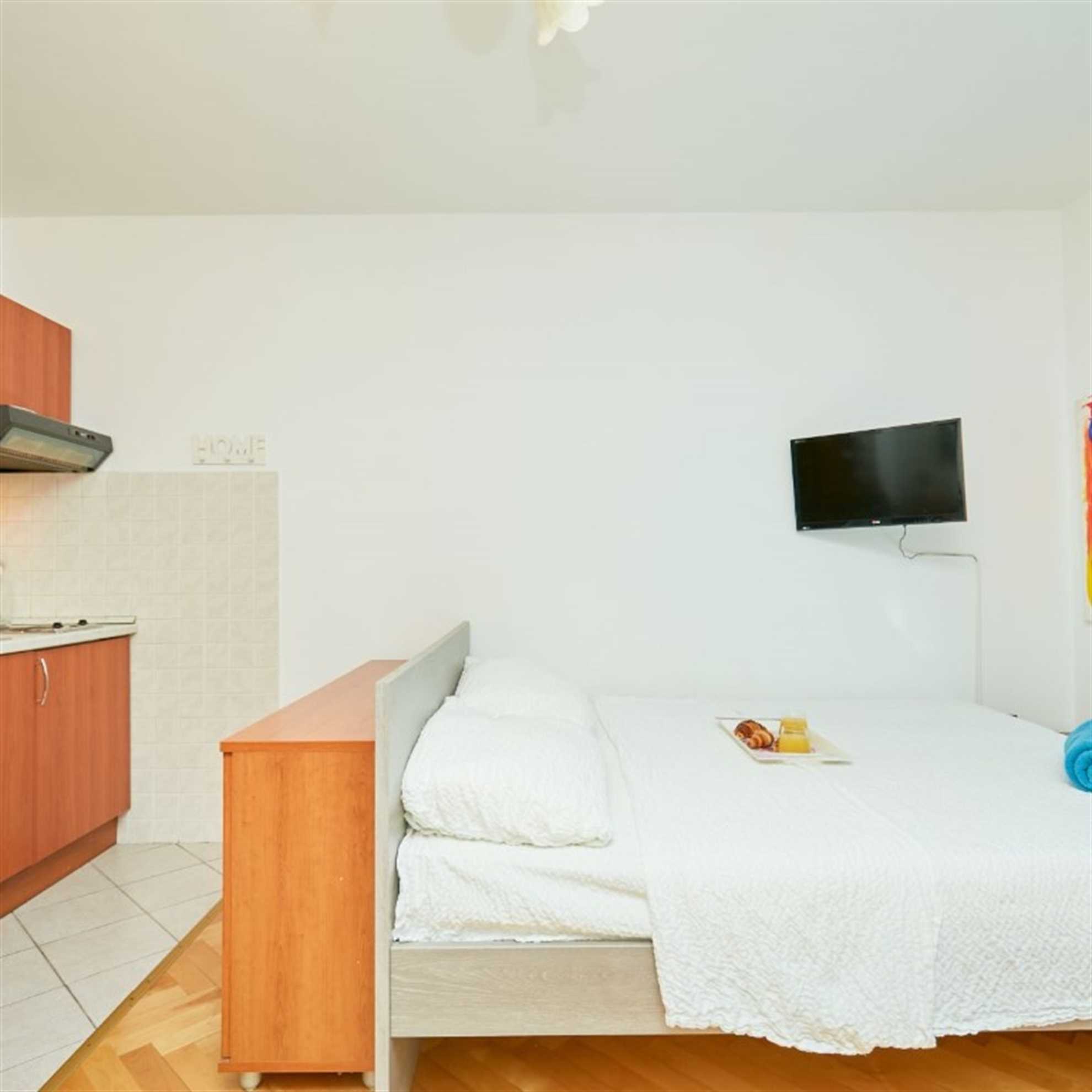 This charming studio apartment has the perfect location and anything a person could need to make his vacation as homely as possible. The space offers enough room for three people, it has 2 twin beds and a couch bed for one. It features a kitchenette equipped with kitchenware, fridge, kettle, toaster and stove top. You can use the fresh market around the corner to buy fresh groceries to prepare your first Croatian meal. If you would rather enjoy the Croatian cuisine you can surely find a nice Restaurant on Lapad promenade just outside of your apartment.